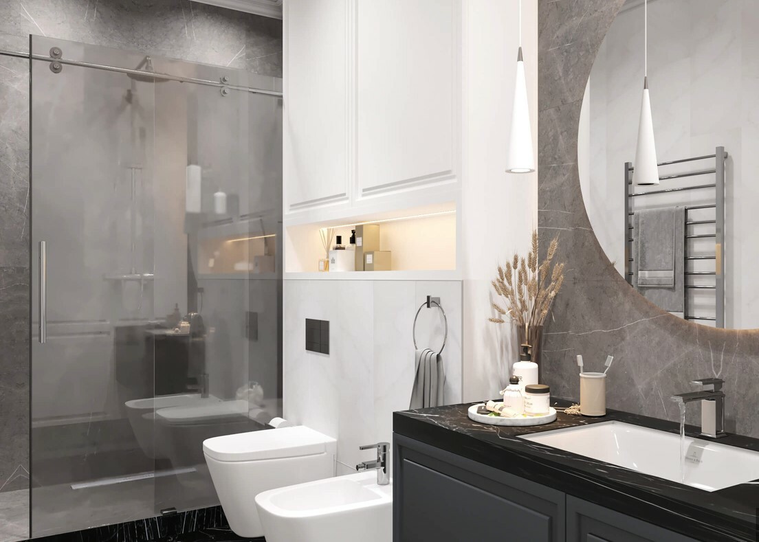 При необходимости гостиная превращается в изолированную гостевую спальню, и для удобства размещения гостей в ней организована собственная гардеробная. Также к услугам гостей отдельный сан.узел.