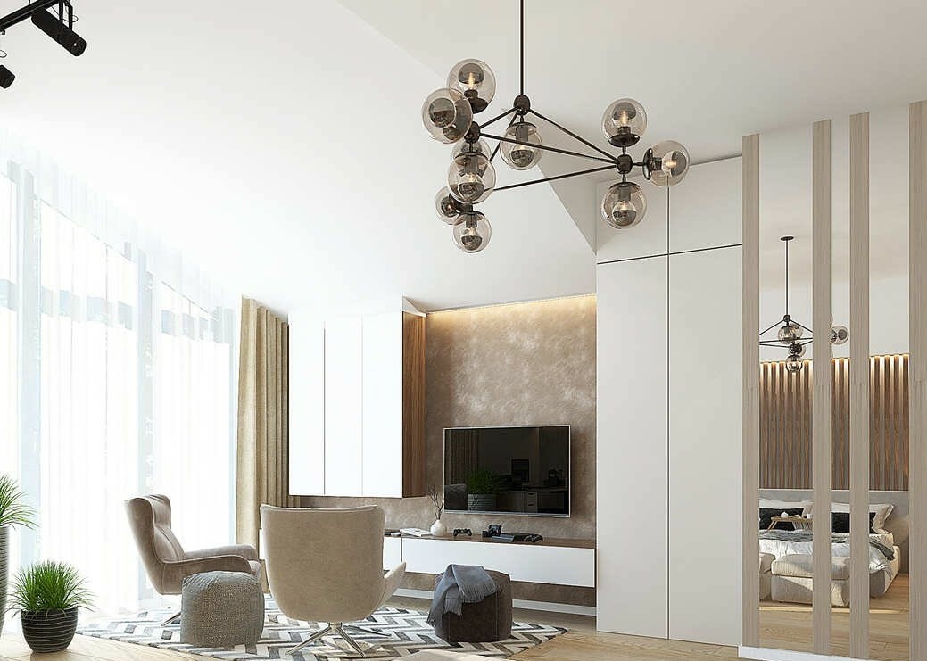 Интерьер для молодой девушки был выполнен в современном стиле с элементами лофта. Жилая комната поделена на две зоны - спальню и гостиную, а разделяет их лофт-перегородка. Кухня была совмещена с балконом, а там размещен кабинет.